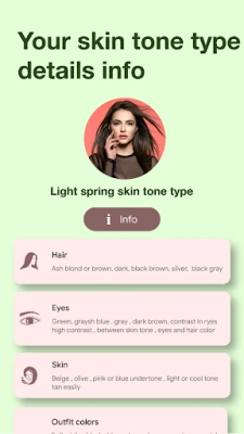 In the information section, you will get the all details of hair, eyes, skin, outfit colors, jewelry, lipstick, etc, coming under the season. You will also get tips to choose the color.