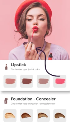 In the outfit section, you will get a color palette suitable to the season. Virtually try different outfits with colors. Select the perfect color palettes for your wardrobe, outfits, and makeup, and create stylish, trendy & fashionable looks. You get the option to add a photo containing your face or take a photo from the camera to check virtually whether the outfit suits you or not.